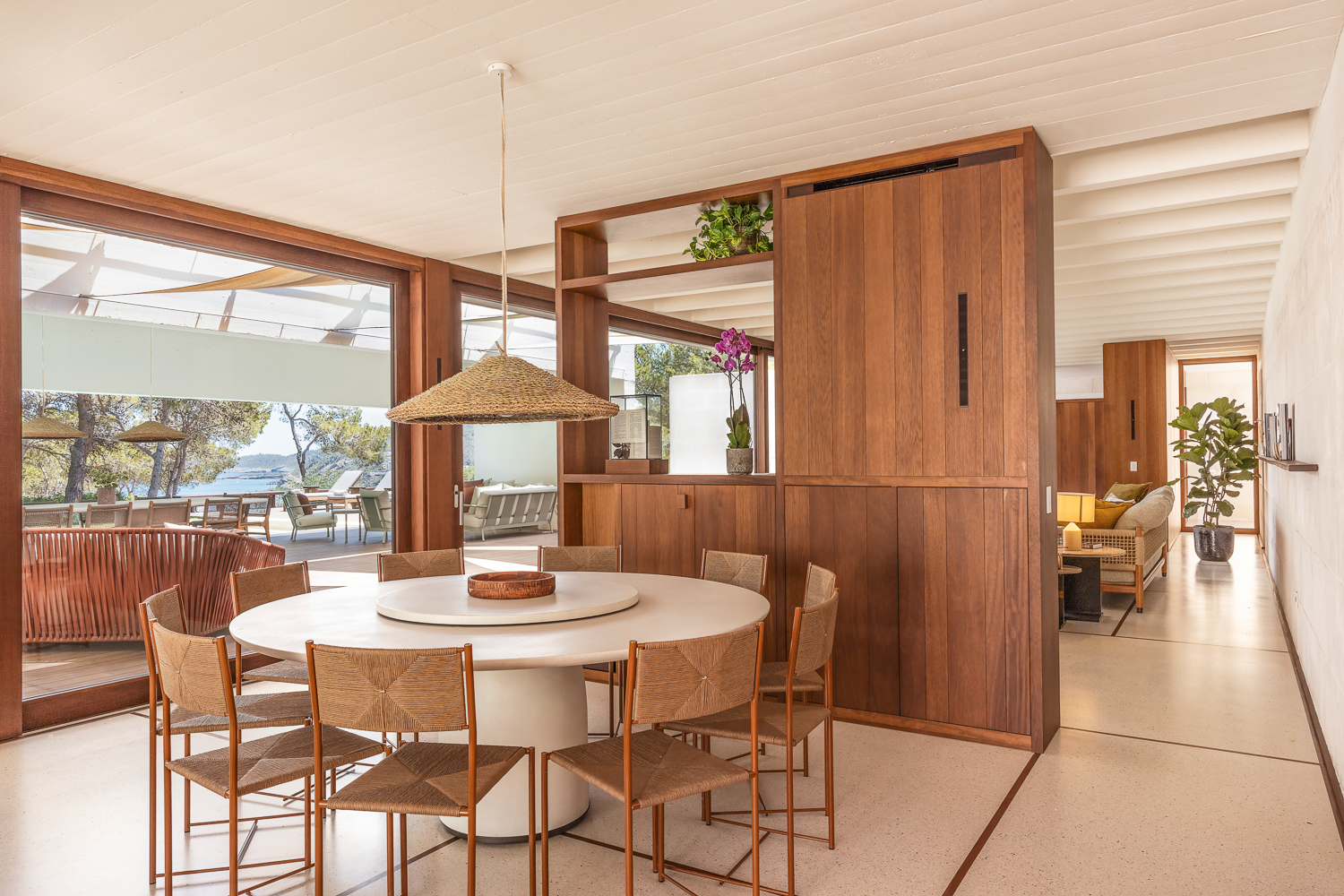Nestled between the beaches of Aigües Blanques and Sant Vicente, Villa Aurea is just a 10-minute drive from the charming village of Santa Eularia des Riù. The villa's location offers an ideal balance of seclusion and accessibility, surrounded by nature yet within easy reach of local amenities and attractions.