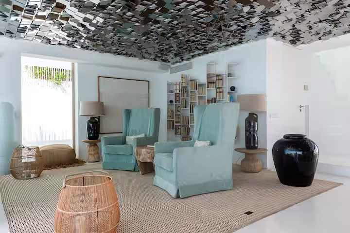 Esta zona es muy especial, ya que te sentirás como si estuvieras dentro del mar. Gracias a las puertas corredizas de cristal que van del suelo al techo, puedes unir la sala de estar y la piscina en un solo espacio. Esta zona cuenta con un detalle de diseño muy especial, una obra de arte: el techo está cubierto con láminas de acero que brillan con la luz del sol, creando una atmósfera mágica tanto de día como de noche.