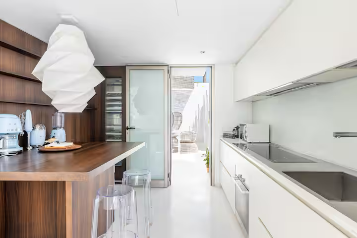 Al otro lado de la casa, en esta misma planta, se encuentra la habitación del personal, que es un miniapartamento, ya que cuenta con una pequeña cocina con lavavajillas, horno, vitrocerámica y un pequeño frigorífico.