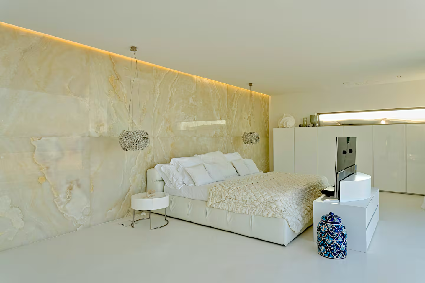 Planta superior, 120 m². El dormitorio y el baño tienen las mismas vistas que la sala de estar: las vistas al mar más hermosas que puedas imaginar. La pared detrás de la cama es de mármol, la habitación tiene mucho espacio de guardarropas y, además, cuenta con un jacuzzi en la terraza con vistas al mar, ideal para disfrutar del atardecer.